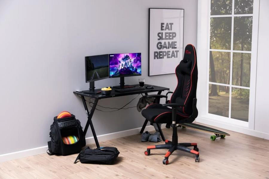 - Salto stof zwart 54, onderstel mat zwart nylon en rood polypropyleen