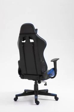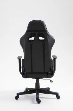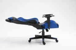 De Gamestoel met kantelfunctie en verstelbare armleuningen (blauw/zwart) is bekleed met hoogwaardig zwart PU-leer en contrasterend rood gaas. De rugleuning is tot 150 graden kantelbaar (bijna tot ligpositie). De armeleuningen zijn zowel in hoogte verstelbaar als draaibaar naar links en rechts en instelbaar naar voor of achter. De bureaustoel kan traploos in hoogte worden versteld. De Gamestoel met kantelfunctie en verstelbare armleuningen (blauw/zwart) bevat tevens een afneembaar hoofdkussen en lendenkussen.