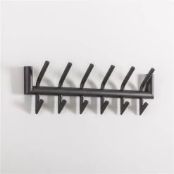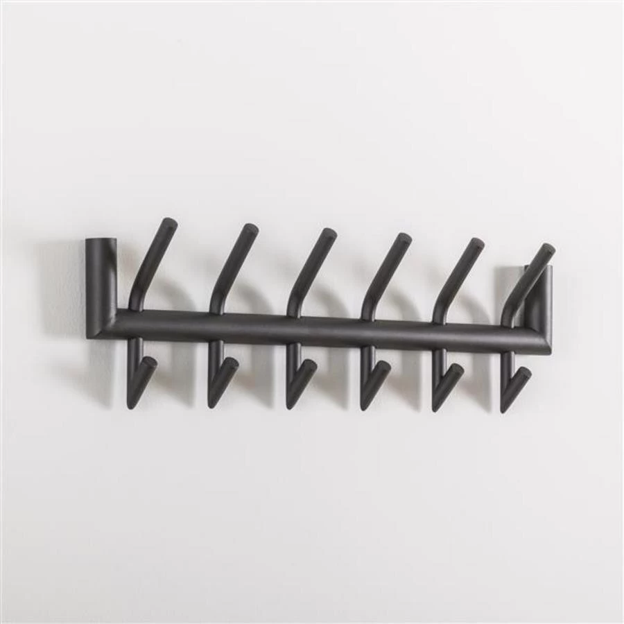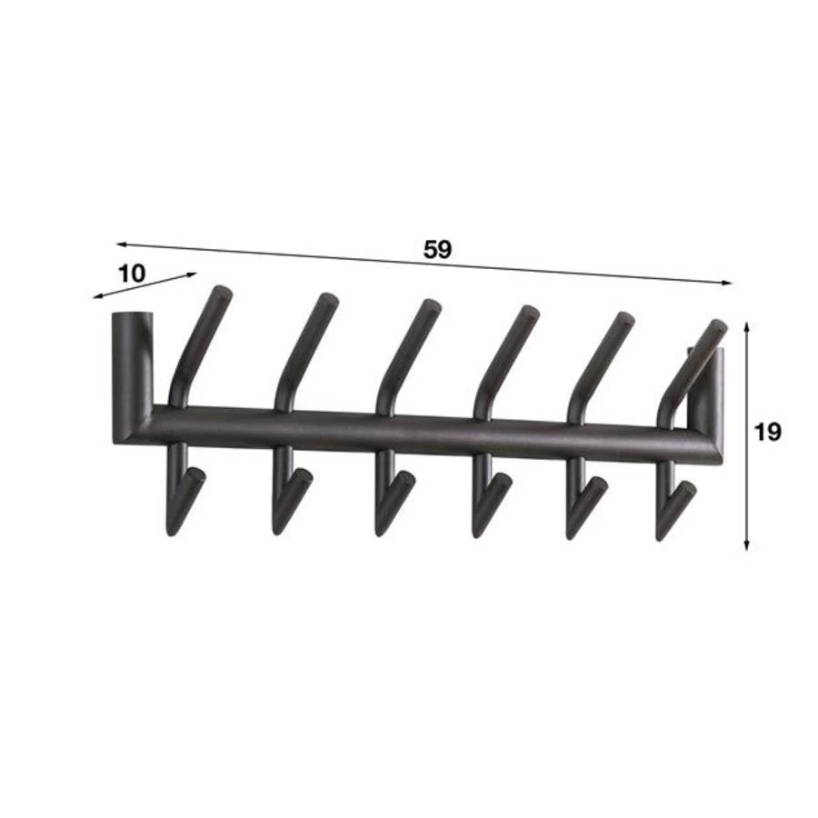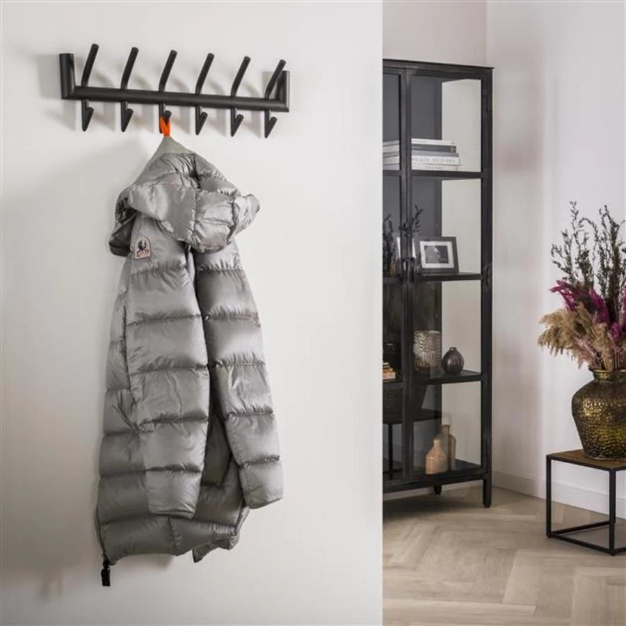 Deze kapstok heeft een ronde buis, uitgevoerd in donkergrijs mat gepoedercoat staal. In totaal heeft dit model 6 gelaste haakjes, die zowel aan de bovenkant als aan de onderkant een ophangmogelijkheid hebben. De stoere kapstok wordt opgebouwd geleverd en kan door middel van twee bevestigingspunten eenvoudig aan de wand worden gemonteerd. Deze kapstok heeft ook een 8- haaks uitvoering.
