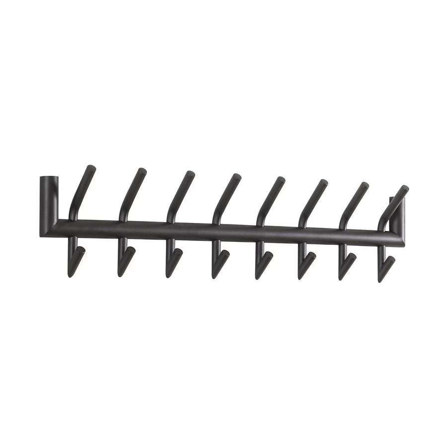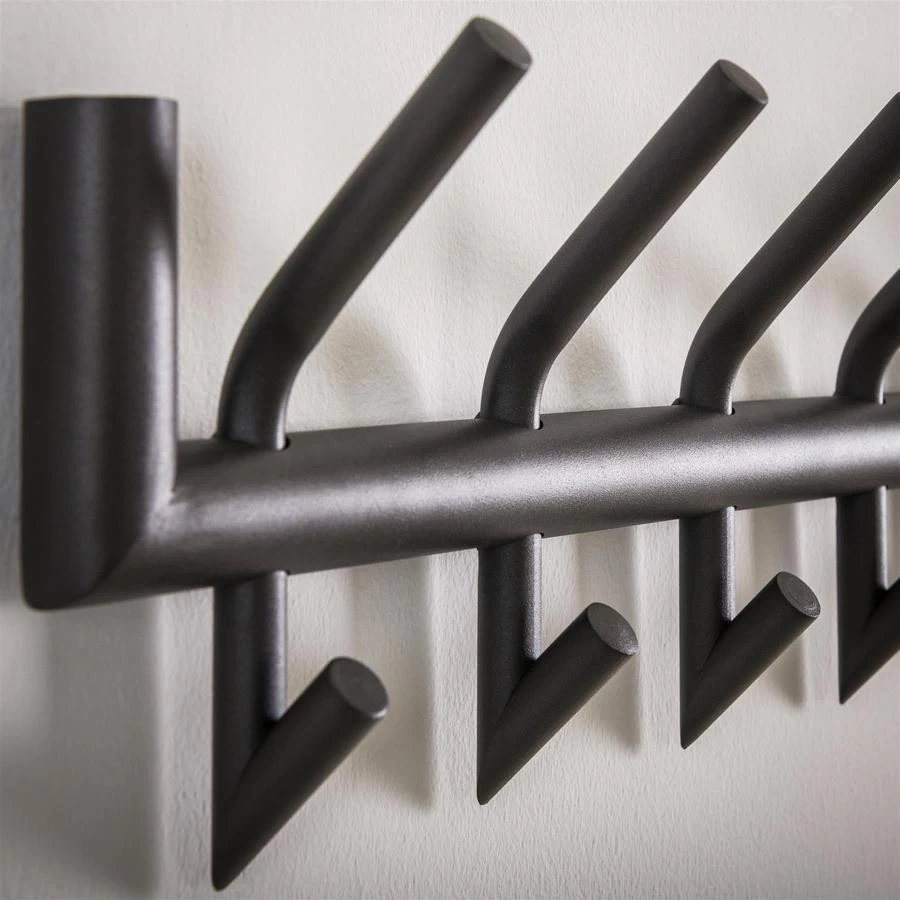 Deze kapstok heeft een ronde buis, uitgevoerd in donkergrijs mat gepoedercoat staal. In totaal heeft dit model 8 gelaste haakjes, die zowel aan de bovenkant als aan de onderkant een ophangmogelijkheid hebben. De stoere kapstok wordt opgebouwd geleverd en kan door middel van twee bevestigingspunten eenvoudig aan de wand worden gemonteerd. Deze kapstok heeft ook een 6- haaks uitvoering.