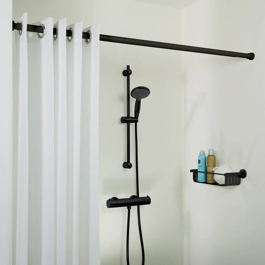 Boren niet jouw ding? De Sealskin douchegordijnstang klem je snel en eenvoudig tussen jouw douchewanden. Dankzij de verstelbaarheid past hij in ruimtes van 125 cm tot maximaal 220 cm. Daarnaast heeft de stang een doorsnede van 28 mm en is daarmee geschikt voor vrijwel alle soorten douchegordijnringen. De Seallux-stang hangt stevig op zijn plek, is gemaakt van aluminium en uitgevoerd in de kleur zwart.